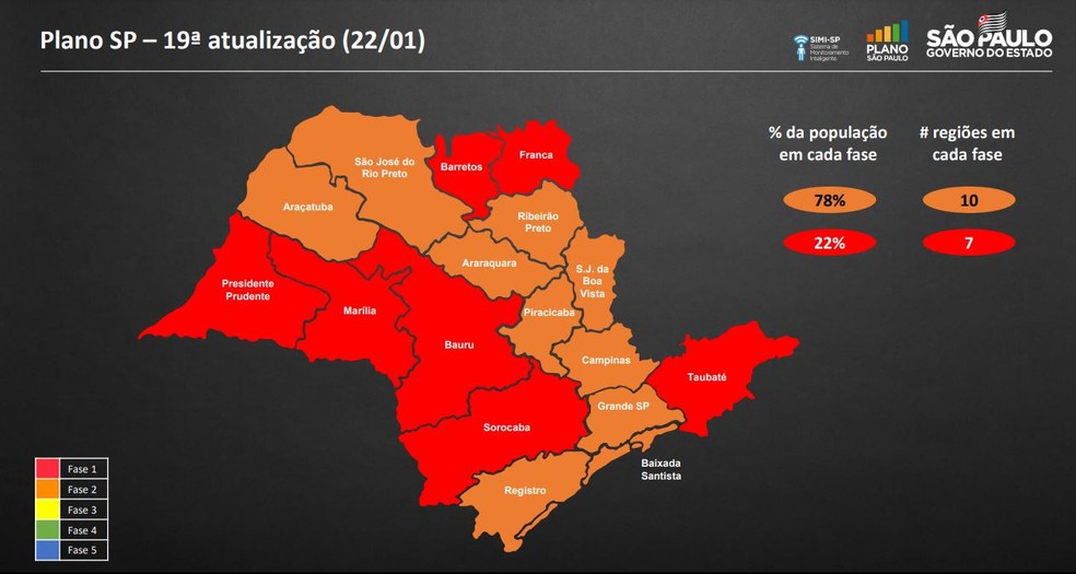 O Governo do Estado de São Paulo acaba de divulgar que, a partir desta segunda-feira, 25, todas as cidades do estado ficam na FASE VERMELHA nos dias úteis, das 20h às 6h da manhã, e nos dois finais de semana e feriados a partir do dia 30 de janeiro, sábado, podendo funcionar somente serviços essenciais nestes períodos. Bares, restaurantes e comércio não poderão funcionar – apenas delivery.