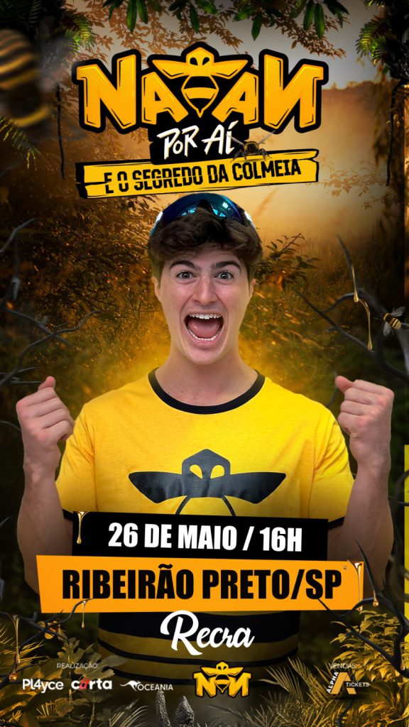 Natan chega a Ribeirão Preto com o espetáculo “Natan por aí e o segredo da colméia” no dia 26 de maio, às 17h no espaço da Recra. Natan, criou o canal “Natan por Aí” em 2017 e desde então produz conteúdo focado em esportes, saúde, aventuras, diversão, desafios e muito entretenimento.
