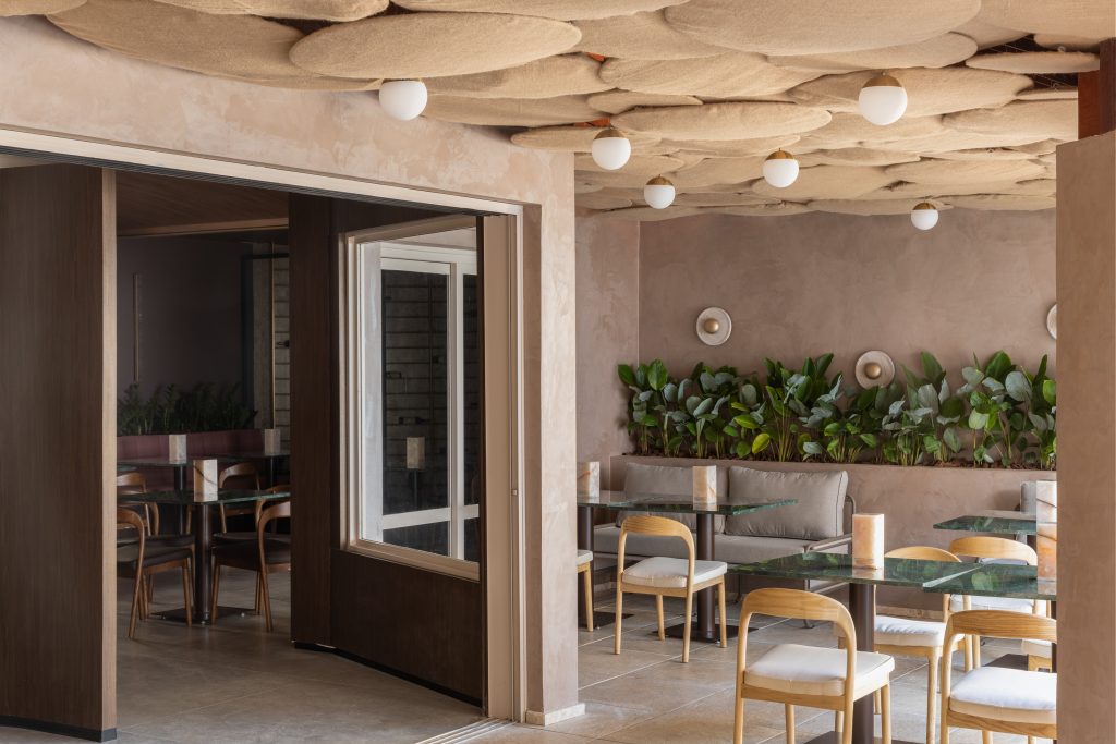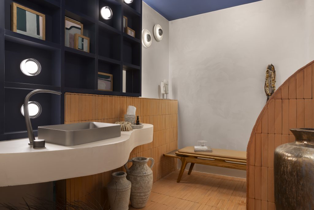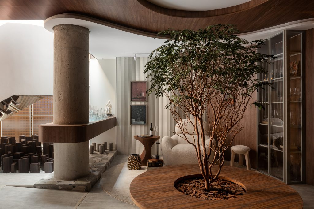 Jardins internos, fontes de água e a escolha de materiais que remetem ao natural compõem espaços como o Espaço Reconecta, de Joel Pereira, Marina Moro e Vivian Cantarino, pensado para estimular o relaxamento e equilíbrio. No Restaurante Brisa, de Carina Rezende e Maísa Andrade, a vegetação ocupa a varanda e se integra ao mobiliário, transformando a experiência gastronômica em um convite à contemplação e à vivência ao ar livre.
