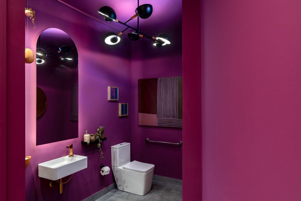 O Pimenta Ardida Bar by Manhattan, de Adriana Fontana, aposta no vermelho intenso aplicado na piscina e no container, resultando em um espaço vibrante e moderno, que traduz energia e ousadia. Já o Lavabo Futurista, de Natália Hetem, utiliza a cor violeta inspirada em imagens de galáxias, trazendo para o ambiente uma atmosfera cósmica e tecnológica. A tendência evidencia como a cor pode deixar de ser detalhe e se transformar no ponto de partida para o conceito de um projeto.